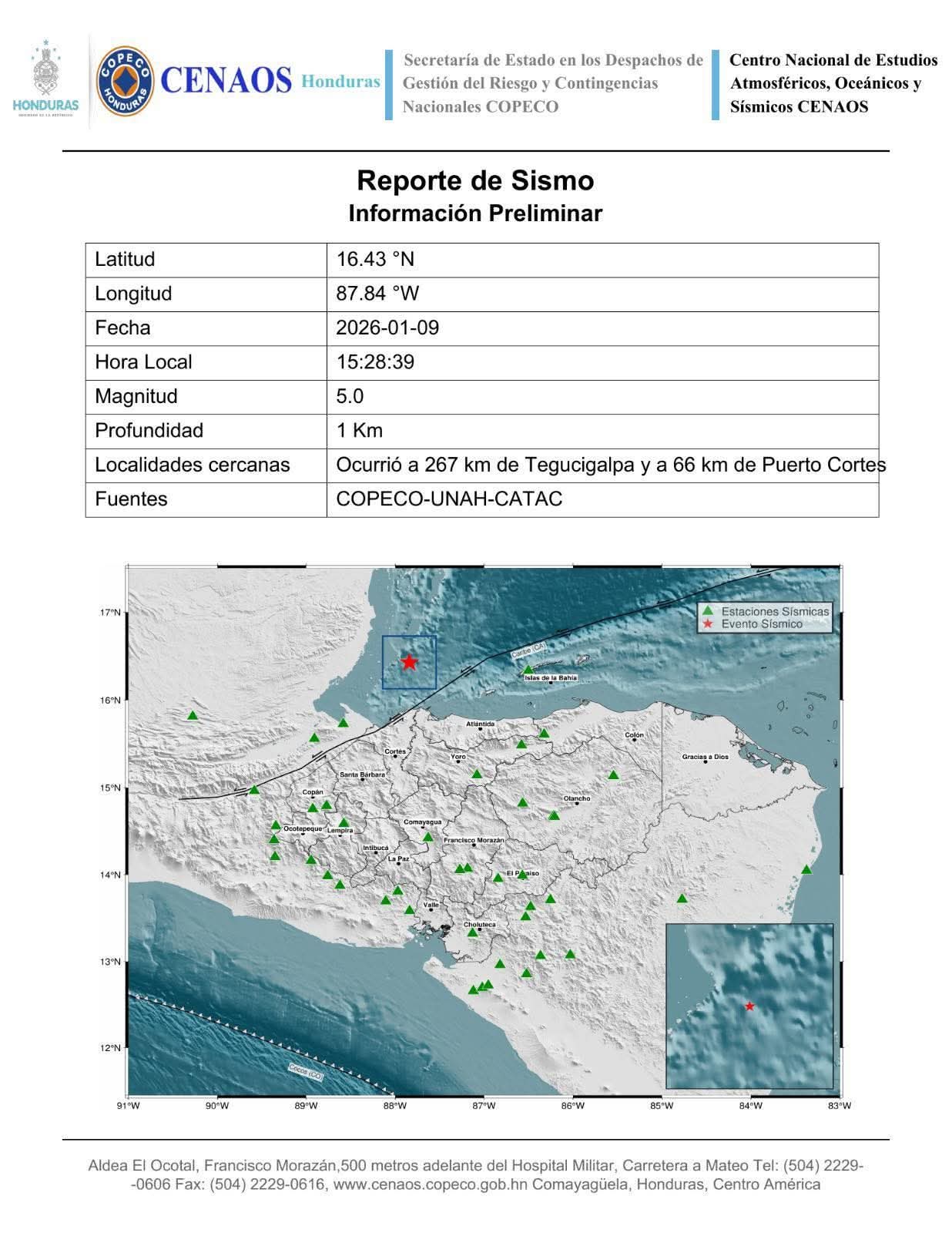 COPECO INFORMA_ Esta tarde del viernes 09 de enero, ocurrió un sismo de magnitud 5.0, con profundidad de 1 km,…