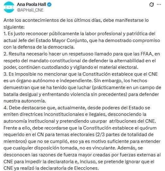NACIONALES| ¡»Nos mantendremos firmes»! La presidenta del Consejo Nacional Electoral (CNE), Ana Paola Hall, aseguró que la declaratoria de las Elecciones Generales es legal, transparente y fue realizada dentro del plazo establecido por la ley, a pesar de los obstáculos y la violencia política registrada en los últimos días.