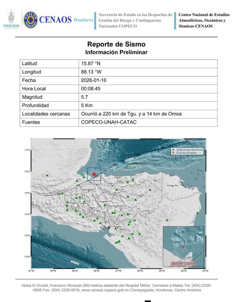 NACIONALES | Esta madrugada de viernes 16 de enero se registró un sismo de magnitud 5.7 con profundidad de 5 km, localizado en el Caribe hondureño, precisamente a 14 km de Omóa, Cortés.