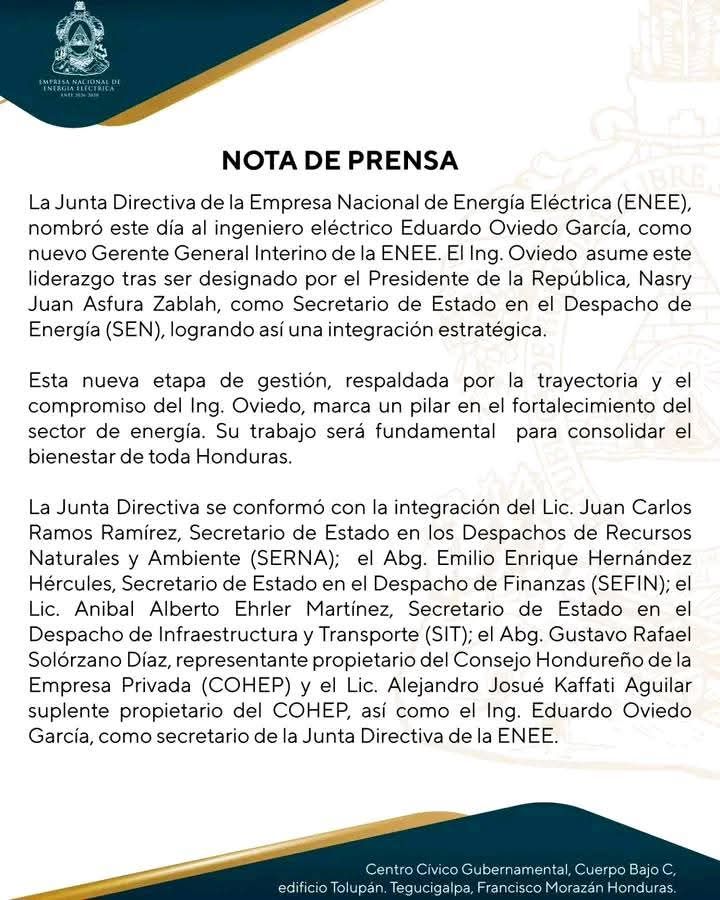 | La nueva junta directiva de la #ENEE ha nombrado el día 03 de febrero de 2026, al ingeniero Eduardo Oviedo García como gerente general interino de la estatal eléctrica.