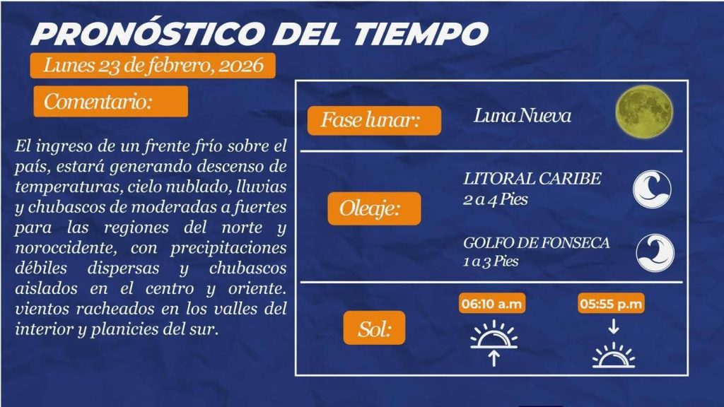 El ingreso de un frente frío sobre el país, estará generando descenso de temperaturas, cielo nublado, lluvias y chubascos de moderadas a fuertes para las regiones del norte y noroccidente, con precipitaciones débiles dispersas y chubascos aislados en el centro y oriente. vientos racheados en los valles del interior y planicies del sur.